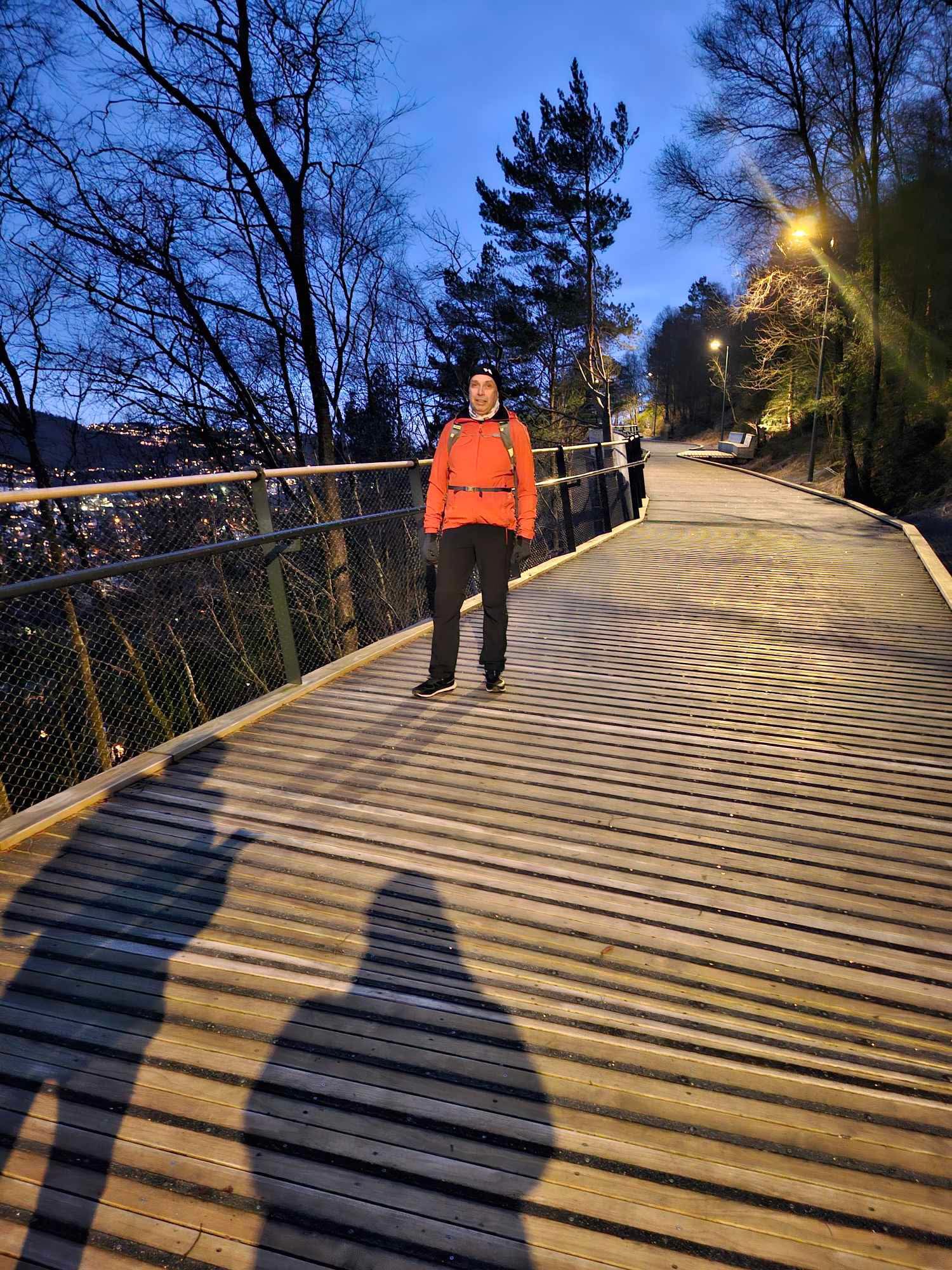 Erik går med vektvesten sin på fjell turer i Bergen. Her er han på vei opp Løvstien.