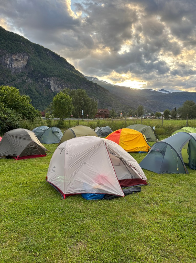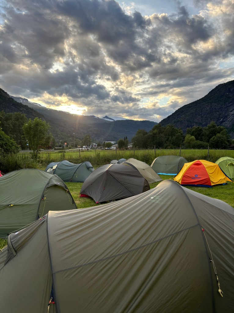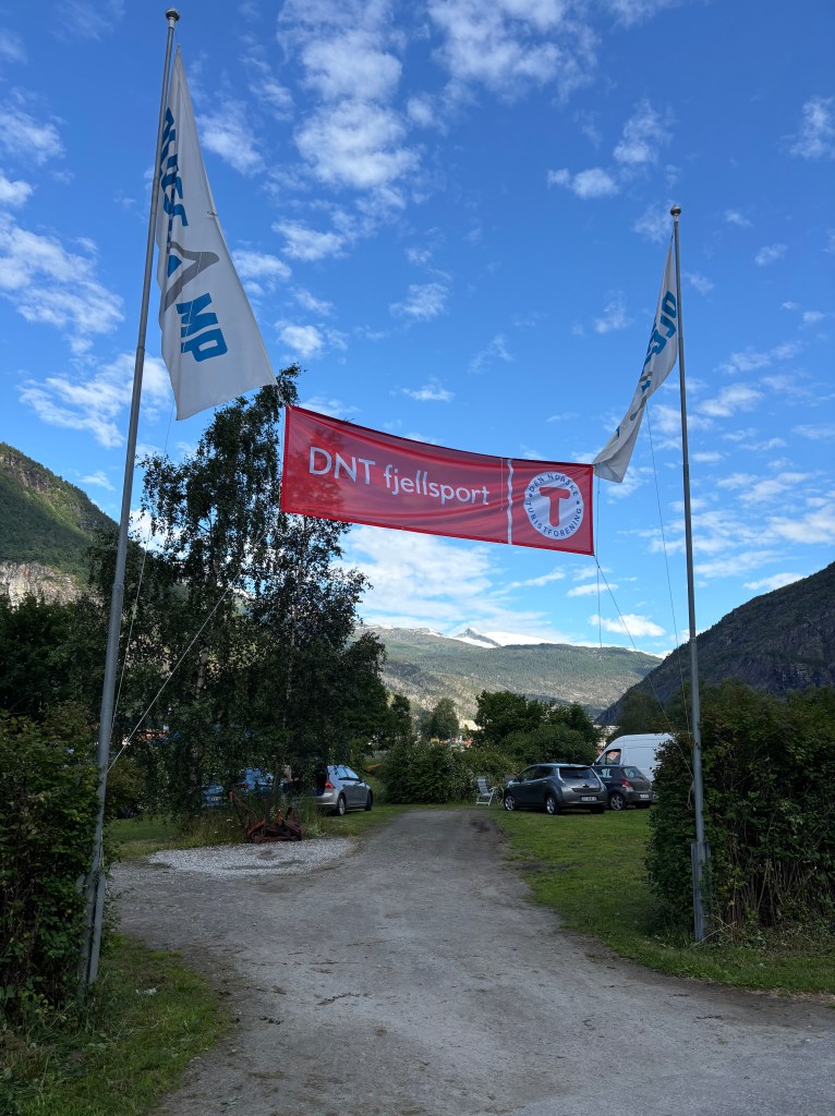 Avreise fra Oslo S med tidlig morgen tog med ankomst Voss litt over kl.12.00. Erik kom med bil fra Osøyro og plukket med opp på Voss. Derfra kjørte vi direkte til Gaupne i Sogn. Rakk å sette opp teltet før det var fellessamling med presentasjon, informasjon og felles grill. Vi var ca 50 deltakere og 10 turlederer/føringingsledere. Turer med turledere var gratis mens turer med turførerer kostet lit ti overkant av 460 kr. pr.tur.
