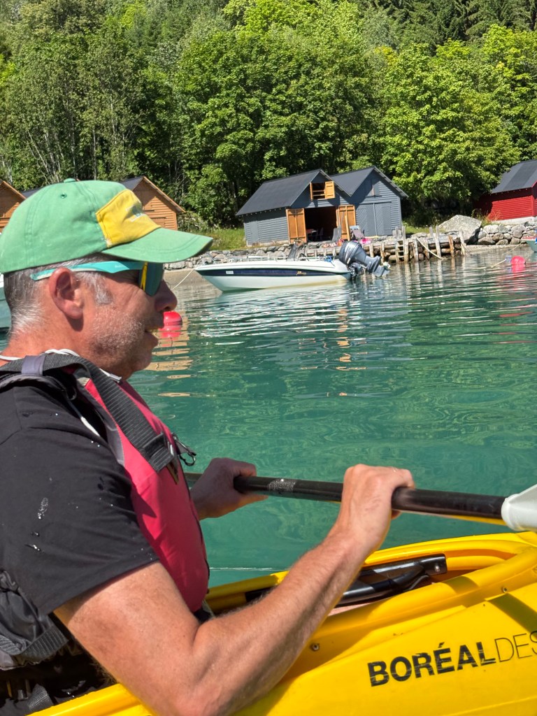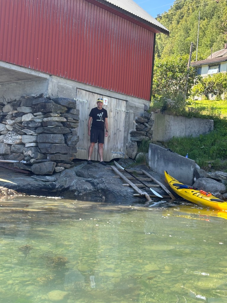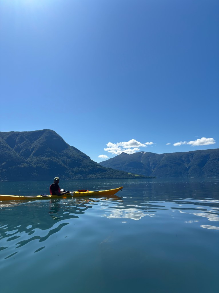I enden av veien fra Marifjøra ligger det er rødt naust der en kan leie kajakker fra DNT for 150 kroner hvis en har DNT nøkkel. Vi fikk oss en super fin 15 kilometer padletur til Solvorn og der vanket det softis og kaffe før vi retunerte. Store deler av turen fikk vi følge fra en sel.